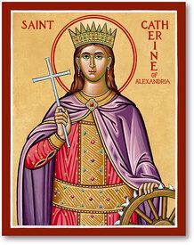 According to an ancient legend, Catherine is believed to have been born in the early 2nd Century in the city of Alexandria, Egypt. As a young woman she was overcome by a vision of the Madonna and the Christ Child who convinced her to become a Christian. She studied religious and secular texts becoming a philosopher and skilled defender of the faith.
